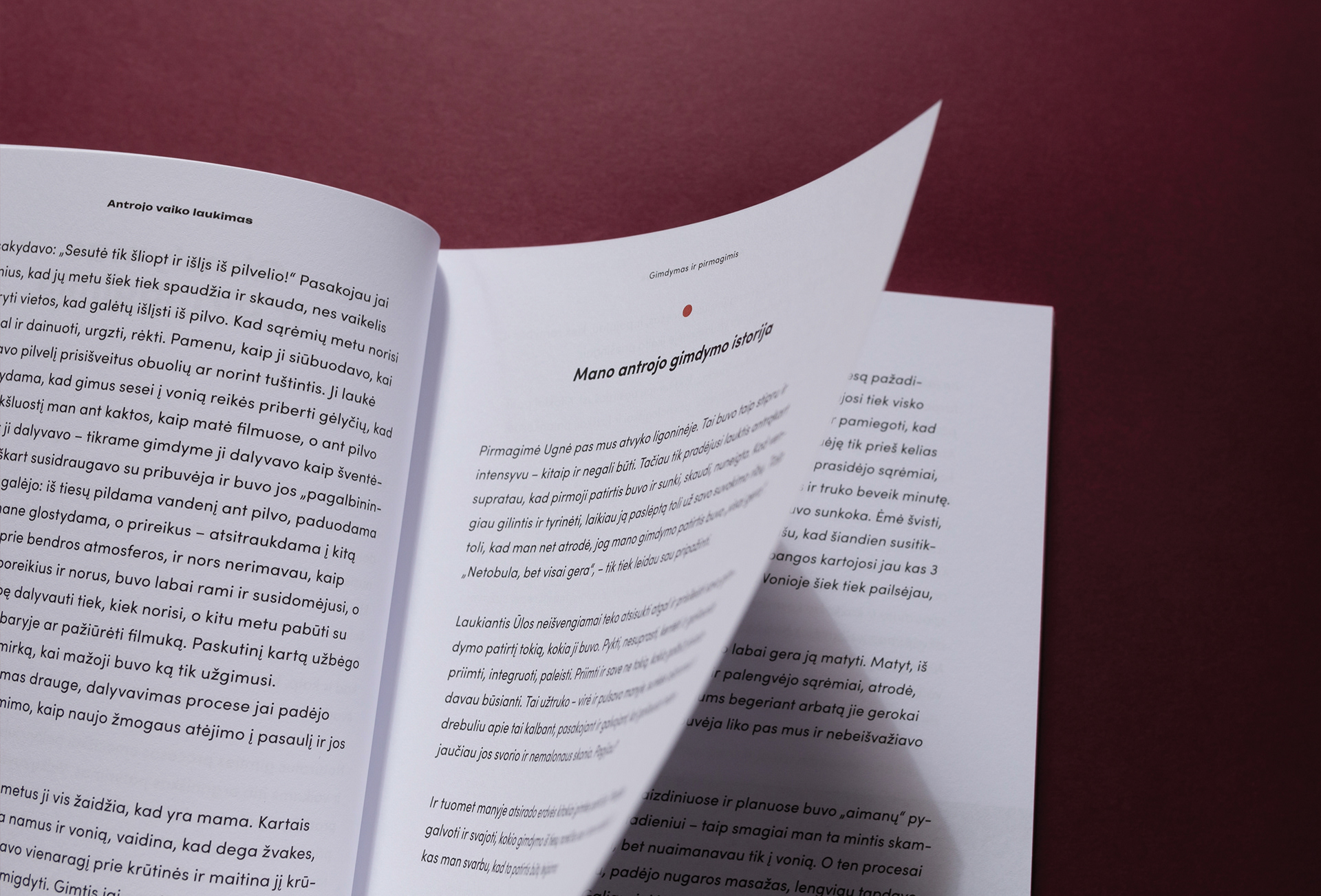 The content itself dictated the design of the book: a bright, bold design was born, which is balanced by photographers Ugnė Poloudina photos. Also 4 geometric shapes travel along with the text throughout the book illustrating and symbolizing: a mother, younger and older children, a father and the relationship between them.