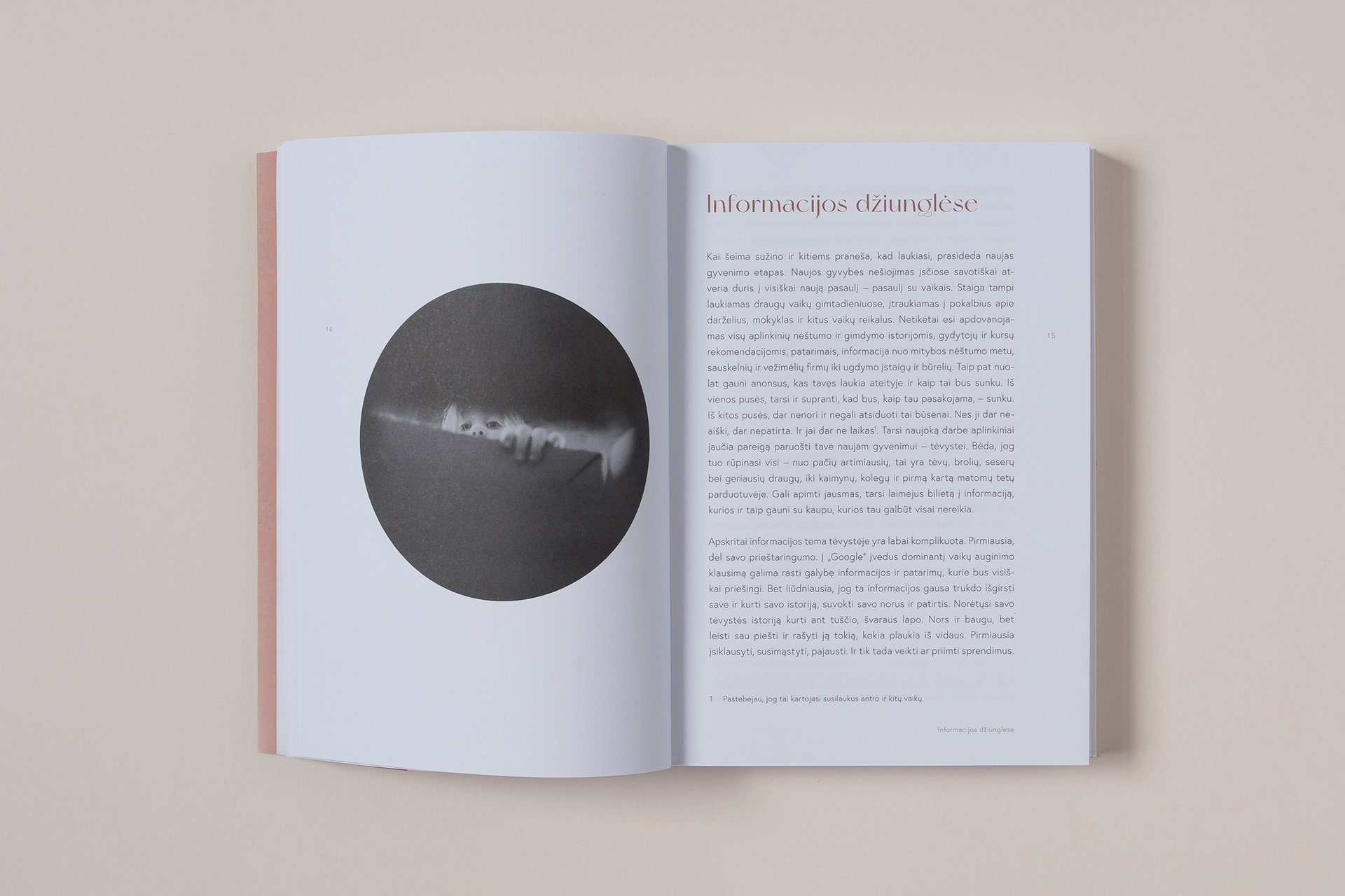 how important it is to have a connection with yourself in order to create a connection with your child. This idea carries over to the cover of the book. The design of the book goes hand in hand with the text: it is light and spacious, allows reader to stop and rest. Additional rhythm and emotion is created by images and image placement. Design of the book is not overpowering, it embraces both content and the reader.